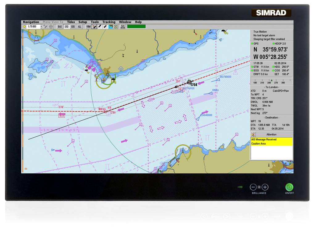 According to the manufacturer, the Simrad MARIS ECDIS900 are easy to use, with a standard Windows PC interface, and facilitate advanced route planning and optimization tools with special-purpose modules including search-and-rescue planning. The systems, which support electronic navigation charts from most leading hydrographic chart providers, offer integrated chart management with online ordering and updates. Other features include position prediction, docking assistance and a universal radar overlay. The Mk5 system comes with a 24- or 26-inch flat panel monitor and standard PC. The Mk 15 has a 19- or a 24-inch flat panel display and an integrated PC.
